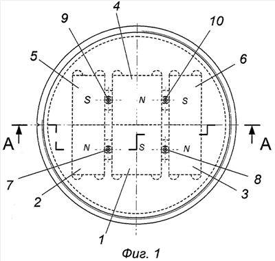 Четвертый, пятый и шестой постоянные магниты 4, 5 и 6 расположены рядом соответственно с первым, вторым и третьим постоянными магнитами 1, 2 и 3 и обращены к рабочей поверхности корпуса полюсами N, S и S, полярность которых противоположна полярностям обращенных к рабочей поверхности корпуса полюсов S, N и N соответственно первого, второго и третьего постоянных магнитов 1, 2 и 3. Конструкции постоянных магнитов 4, 5 и 6 идентичны конструкциям соответственно первого, второго и третьего постоянных магнитов 1, 2 и 3.