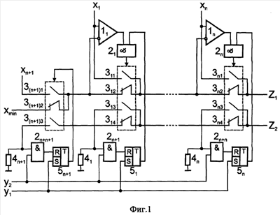 Работа предлагаемого рангового селектора осуществляется следующим образом. На его первый,…, (n+1)-й информационные входы подаются соответственно аналоговые сигналы (напряжения) x1,…, xn+1, а на его идентифицирующем выходе и входе ключа 3(n+1)2 фиксируются соответственно сигнал логической «1» (Z2=1) и опорное напряжение xmin1,…, xn+1. На первый, второй настроечные входы предлагаемого рангового селектора подаются соответственно импульсные сигналы y1, y2 {0,1} (фиг.2), причем период Т и длительность импульса сигнала y2 должны удовлетворять условиям Т> t и <2 и+ Тр+ Кл, где t=( К+ И+ Кл)n+ И+ Tp+ Кл, a И, Tp, Кл и K есть длительности задержек, вносимых элементом И, RS-триггером, ключом и дифференциальным компаратором. В j-й группе замыкающие ключи замкнуты (разомкнуты), размыкающие ключи разомкнуты (замкнуты), когда на управляющем входе этой группы ключей присутствует логическая «1» (логический «0»). Если сигнал на неинвертирующем входе компаратора 1i больше (меньше) сигнала на его инвертирующем входе, то на выходе этого компаратора имеем логическую «1» (логический «0»). Импульс сигнала y1 устанавливает в «1» сигнал на неинвертирующем выходе всех RS-триггеров, при этом с учетом указанного выше принципа работы ключей и дифференциального компаратора, на информационном выходе предлагаемого рангового селектора в момент времени t1 (см. фиг.2) имеем сигнал x(n+1) (n+1)-го ранга (наибольший из сигналов множества {х1,…, хn+1}), то есть