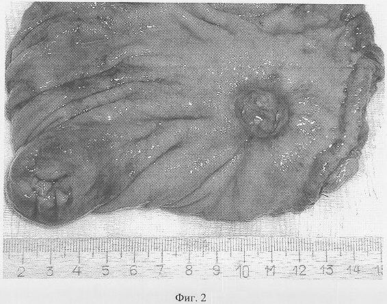 В течение первых 8 суток послеоперационного периода после формирования пенетрирующей язвы наблюдалась мелена. При эндоскопическом исследовании на 20 сутки послеоперационного периода в антральном отделе желудка по малой кривизне выявлена глубокая каллезная язва диаметром не менее 25 мм с признаками пенетрации, в дне язвы фибрин и некротические массы. После выведения животного из опыта на 21-е сутки произведено изучение макропрепарата: в нижней трети тела желудка по малой кривизне определяется гигантская язва диаметром 25 мм и глубиной 8 мм с пенетрацией в малый сальник (фиг.2: гигантская пенетрирующая язва тела желудка у беспородной собаки через 21 день после операции).