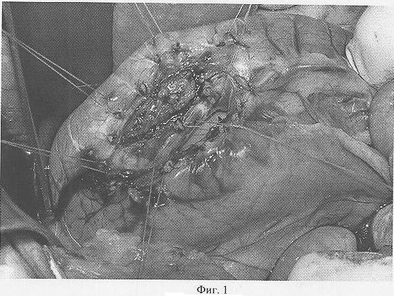 Способ осуществляется следующим образом. В положении собаки лежа на спине, на операционном столе под наркозом выполняют лапаротомию. На заданном участке стенки желудка или двенадцатиперстной кишки производят рассечение серозно-мышечной оболочки стенки кишки в форме овала или окружности диаметром более 20 мм. Отдельными узловыми швами прошивают видимые подслизистые сосуды по линии рассечения серозно-мышечной оболочки (фиг.1: формирование гигантской язвы двенадцатиперстной кишки с пенетрацией в поджелудочную железу у беспородной собаки). Иссекают участок стенки кишки между наложенными узловыми швами. Образованный дефект в стенке кишки фиксируют двухрядными швами по окружности к прилежащему органу (поджелудочной железе, печени, большому либо малому сальнику, соседней кишке, забрюшинному пространству и пр.). Ушивают брюшную полость.