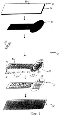 Первый слой 14 из неприкрепляющего материала, например полимерного покрытия, напечатан на пленку 12 соответствующим печатным средством, например ротационной печатной машиной с узкой лентой и УФ типографской краской. Первый слой 14 имеет участки 16 крепления, представляющие собой выполненные в первом слое 14 отверстия. Участки 16 крепления выполнены в виде букв, составляющих соответствующие слова, например НЕ ИМЕЕТ СИЛЫ, ВСКРЫТО, НЕДЕЙСТВИТЕЛЬНО или, как в рассматриваемом примере, COLOURVOID. Участки 16 крепления по существу не имеют неприкрепляющего материала. Неприкрепляющий материал представляет собой полимерное покрытие, которое не прилипает к подложке 12, и может быть нанесенной с помощью ротационной печати УФ типографской краской, имеющей короткоцепочечные полимерные молекулы, образующие сетчатую структуру.