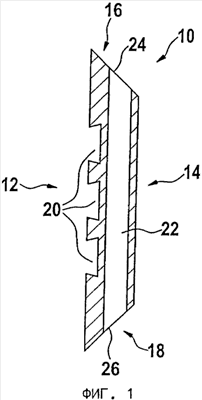 Фиг.1 изображает металлический корпус плиты, использующийся в соответствии с настоящим изобретением для изготовления холодильной плиты (также называемого «плитового холодильника»), которая монтируется к внутренней стороне кожуха металлургической печи, например доменной печи. Этот корпус 10 плиты имеет переднюю поверхность 12, заднюю поверхность 14 и четыре периферийных поверхности. Две из этих четырех граничных поверхностей обозначены на чертеже цифрами 16, 18, причем две другие граничные поверхности на сечении Фиг.1 не видны. Граничные поверхности 16 и 18 скошены в направлении задней поверхности 14 корпуса плиты. Передняя поверхность 12, которая выходит внутрь печи, предпочтительно оснащается выемками 20, увеличивающими охлаждающую поверхность и улучшающими прилегание огнеупорной облицовки. Цифрой 22 обозначен прямой цилиндрический канал, проходящий через металлический корпус 10 плиты под передней поверхностью 12 так, чтобы образовать отверстия 24, 26 на граничных поверхностях 16, 18. Сечение канала обычно имеет круглую форму, но не исключается сечение овальной формы. Корпус 10 плиты имеет несколько таких каналов 22, располагающихся обычно параллельно друг другу.