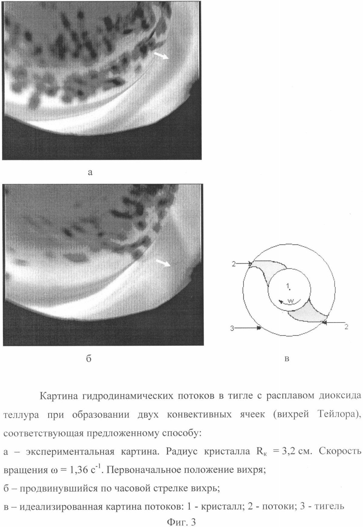 3. При достижении кристаллом некоторого диаметра, примерно равного 0,5-0,6 диаметра тигля, на поверхности расплава образуется устойчивая система двух диаметрально противоположных конвективных ячеек темного цвета, вращающихся в том же направлении, что и кристалл. Такая гидродинамика расплава является оптимальной с точки зрения структурного качества кристаллов парателлурита, может не изменяться в течение 100 и более часов и соответствует реализации предлагаемого изобретения. Оптимальный гидродинамический режим иллюстрируется фиг.3. На фиг.3 изображены: а и б – полученные с помощью цифровой видеокамеры с интервалом 17 секунд картины гидродинамических потоков, а именно – одной из двух конвективных ячеек (вихрей) холодного, более темного расплава диоксида теллура, указанной белой стрелкой, продвигающейся по часовой стрелке в тигле диаметром 10 см с вращающимся в том же направлении со скоростью 1,5 с-1 (14,3 об/мин) кристаллом парателлурита радиусом 3,2 см, вытягиваемым со скоростью 0,25 мм/час; в – идеализированная схема потоков: 1 – кристалл; 2 – две конвективные ячейки (вихри Тейлора); 3 – тигель.