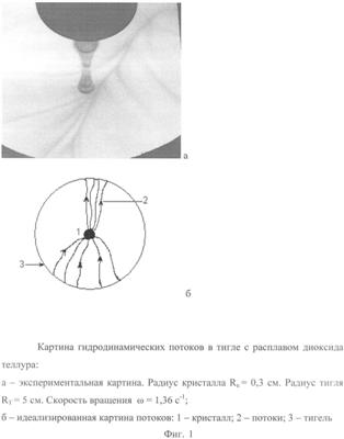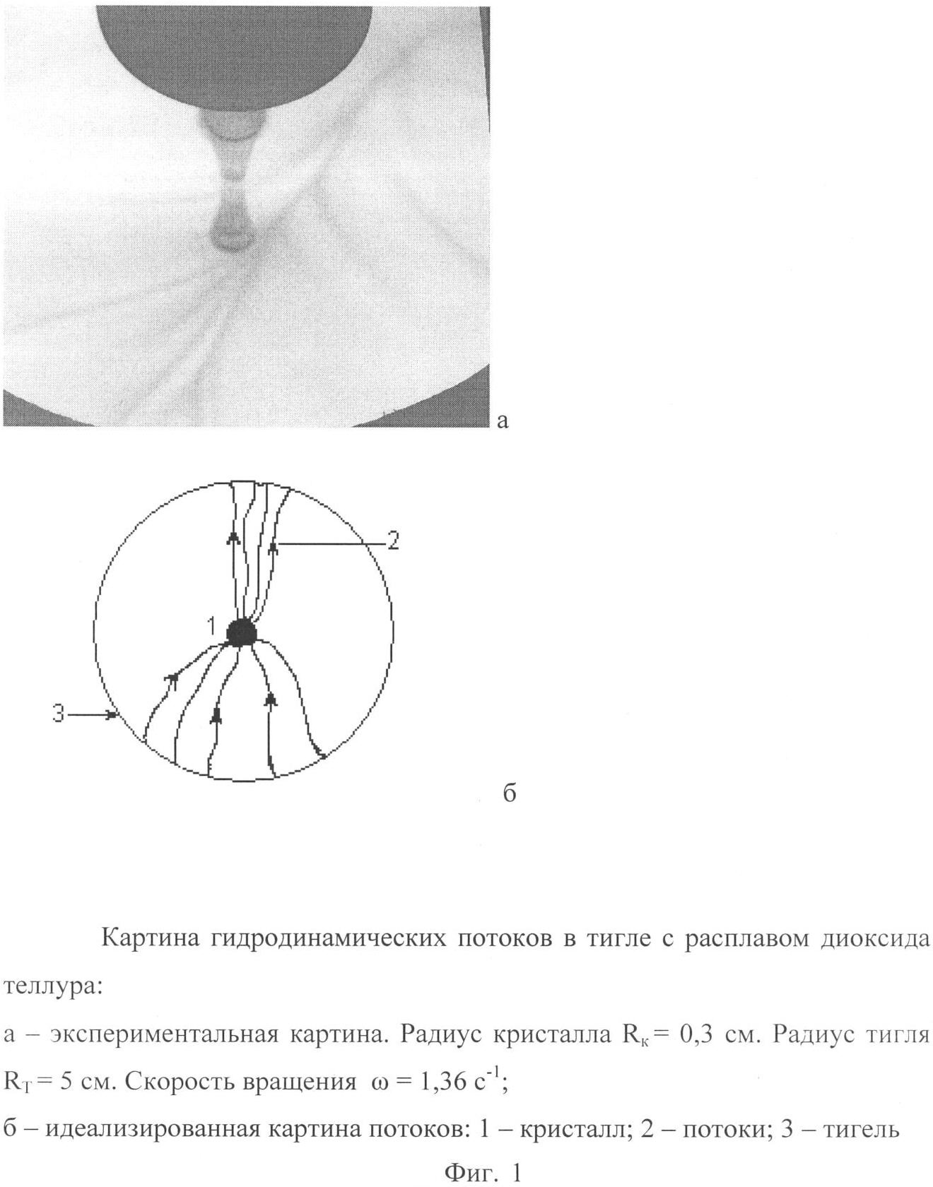 Уникальная возможность непосредственного наблюдения гидродинамических потоков на поверхности расплава диоксида теллура и связанная с ней возможность управления гидродинамикой с помощью программируемого изменения скорости вращения кристалла, реализованные в предлагаемом изобретении, обусловлены необычайно высоким значением критерия Прандтля для расплава диоксида теллура, равном четырем (Pr= / =4, где – кинематическая вязкость, – температуропроводность). Типичные значения критерия Прандтля для расплавов полупроводников и диэлектриков на один-два порядка меньше – Pr10-1-10-2. Таким образом, из-за слабого механизма молекулярной теплопроводности рассасывание неоднородно нагретых тепловых фронтов в расплаве диоксида теллура, образующихся при гидродинамическом массопереносе, происходит медленно, и области с переохлажденным расплавом становятся различимыми визуально и с помощью видеоаппаратуры. При определенных значениях радиуса кристалла и скорости его вращения на поверхности расплава образуется устойчивая гидродинамическая структура с двумя обращающимися соосно с кристаллом диаметрально противоположными конвективными ячейками более темного, чем остальной расплав, цвета. Скорости обращения ячеек вокруг центра тигля примерно в 10-15 раз меньше скоростей вращения самого кристалла. Именно такой гидродинамический режим в расплаве оказывается наиболее благоприятным с точки зрения улучшения качества и увеличения размеров выращиваемых кристаллов парателлурита.