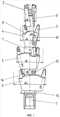 Процесс бурения скважины протекает так. Опережающий резец-забурник 2 оставляет после себя скважину диаметром d1. Резцы следующего за ним первого выступа расширяют ее до диаметра d2, и далее резцы последующих выступов расширяют скважину до диаметров d3, d4 и т.д. Конечный диаметральный размер скважины зависит от количества выступов на державке. Такое равномерно-последовательное увеличение диаметрального размера скважины выравнивает силовую нагрузку на резцы; позволяет бурить глубокие скважины режуще-скалывающим разрушением породы на забое. При этом не возникает необходимость разборки бурового става и замены вышедших из строя зубков до того, как скважина будет пробурена на заданную глубину.