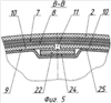 Каркас 5 слоя 9 в этом варианте выполнен аналогично каркасу 5 первого варианта, но он облицован слоем 24 (фиг.5) антиадгезионной фторопластовой пленки и размещен между внутренним сплошным слоем 25 резины и наружным обращенным к силовому слою 8 мембраны 1 слоем, выполненным из отдельных лепестков 10 прорезиненной углеродной ткани. Лепестки 10 расположены между стержнями 22 с перекрытием их боковых сторон и скреплены с внутренним сплошным слоем 25 резины в местах их взаимных контактов с образованием ослабленных меридиональных зон 11.