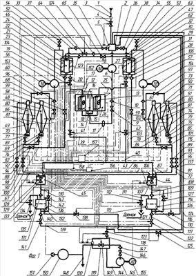 3. Третий режим работы может включаться автоматически согласно программе как по показателям датчиков общей оценки концентрации загрязнителей после фильтров 113 и 135, так и в случае недостаточной очистки во втором режиме работы или сразу после регистрации датчиком общей оценки концентрации загрязнителя 3 недопустимых концентраций загрязнителей в трубопроводе 1. Центральный блок микропроцессорного управления 158 подает команды на закрытие автоматических заслонок 125, 41 и 42, автоматические заслонки 122, 141, 138 и 116, корректирует в соответствии с программой, заложенной в центральный блок микропроцессорного управления 158 и показателями датчиков общей оценки концентрации загрязнителя 3 и общей оценки концентрации загрязнителей после фильтрации. Открываются автоматические заслонки 19, 27, 64 и 65, корректируется их состояние, подается питание на электродвигатели 152 групп насосов 8, они начинают подавать жидкость к электролизеру 7. Подается питание на электродвигатели 153, 154, включаются ультразвуковые излучатели 11, 15, 23, 31, 76, 77, 78 и 79, включаются блоки ультрафиолетового излучения 22 и 30, и жидкость с блока подачи 2 трубопроводом 6 начинает поступать в электролизер 7. С электролизера 7 жидкость из анодной камеры 18 напорным патрубком 17 поступает в анолитный деаэрирующий блок 21. Аналогично с катодной камеры 26 жидкость напорным патрубком 25 поступает в католитный деаэрирующий блок 29. Деаэрирующие блоки, анолитный 21 и католитный 29, выполняют функции ускорителей реакций сгущения, обеззараживания и распределения жидкости. С анолитного деаэрирующего блока 21 часть жидкости патрубком 33 возвращается в блок подачи 2 и с католитного деаэрирующего блока 29 часть жидкости трубопроводом 34 также направляется в блок подачи 2. Этим обеспечивается рециркуляция жидкости по контуру электролизера 7. Подсасывающим патрубком 62 католитный деаэрирующий блок 29 соединен с подсасывающим трубопроводом 46, в свою очередь, анолитный деаэрирующий блок 21 подсасывающим патрубком 63 соединен с подсасывающим трубопроводом 47. Это необходимо для корректировки концентрации анолита и католита в независимых контурах групп анолитных 48 и 49 и католитных 50 и 51 электролизерных электротурбогидроциклонов, тем самым влияя на реакции в них. Всасывающим трубопроводом 46 жидкость с анолитного деаэрирующего блока 21 подается насосным агрегатом 56 в напорную часть электролизерного электротурбогидроциклона 48, а с него патрубком сливной фракции 66 – в напорную часть электролизерного электротурбогидроциклона 49. Аналогично всасывающим трубопроводом 47 жидкость с католитного деаэрирующего блока 29 подается насосным агрегатом 57 в напорную часть электролизерного электротурбогидроциклона 50, а с него патрубком сливной фракции 71 – в напорную часть электролизерного электротурбогидроциклона 51. С анолитных 48 и 49 электролизерных электротурбогидроциклонов часть жидкости патрубками сгущенной фракции 69 и 70 поступает в коммутирующий трубопровод 86, с него, а также с патрубка сливной фракции 68 поступает в анолитный коммутирующий байпасный трубопровод 100 и дальше возвращается в анолитный деаэрирующий блок 21. С католитных 50 и 51 электролизерных электротурбогидроциклонов часть жидкости патрубками сгущенной фракции 74 и 75 поступает в коммутирующий трубопровод 87, с него, а также с патрубка сливной фракции 