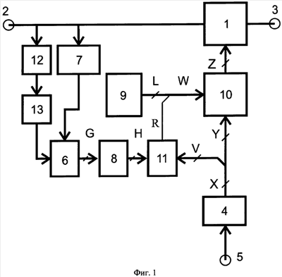 Регулятор переменного напряжения содержит регулирующий орган дискретного действия 1, включенный между входными 2 и выходными 3 выводами, аналого-цифровой преобразователь 4 с выходным кодом Х=(x1, x2, …xn+m), представленным кодом V=(v1, v2, …vn)=(x1, x2, …xn) младших разрядов и кодом Y=(y1, y2, …ym)=(xn+1, xn+2, …xn+m) старших разрядов, соединенный входом с выводами 5 для подключения сигнала управления, счетчик 6, формирователь синхроимпульсов 7, подсоединенный входом к входным выводам 2, а выходом – к входу установки счетчика 6 в нулевое состояние, преобразователь кодов 8 с q-разрядным входом G=(g1, g2, … gq) и n-разрядным выходом H=(h1, h2,…hn), подсоединенный входом к выходу счетчика 6, а выходом к входу компаратора 11, второй вход которого подключен к младшим разрядам выхода АЦП 4, а выход к младшим разрядам R входа сумматора 10, источник 9 сигналов “лог.0” с (m-1)-разрядным выходом L=(l1, l2, … lm-1), сумматор 10 с двумя входами Y=(y1, y2, … ym) и W=(w1, w2, …wm)=[LR] и одним выходом Z=(z1, z2, …zm) одинаковой разрядности m, выпрямитель 12, вход которого соединен с входными выводами 2, и генератор 13, управляемый напряжением, выход которого соединен со счетным входом счетчика 6.