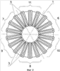 Горизонтальные оси симметрии соседних зубцов (3) образуют угол, определяемый по формуле: