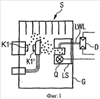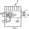 Фигура 2 показывает более детально другую форму выполнения электрического коммутационного аппарата S с двумя коммутационными контактами К1 и К1′. Вследствие показанной здесь формы коммутационных контактов К1 и К1′ как раз в маркированной области будет появляться усиленное обгорание контактов и тем самым усиленное загрязнение. Если это локально усиленное загрязнение должно учитываться при определении обгорания контактов, предпочтительным является дальнейшее развитие соответствующего изобретению устройства. В показанной на фиг.2 форме выполнения соответствующее изобретению устройство содержит один световод LWL для введения света и дополнительный световод LWLQ, который выполнен в качестве источника света. В показанной здесь форме выполнения свет от средства свечения Q на обеих концах дополнительного световода LWLQ вводят в этот действующий в качестве источника света дополнительный световод. Дополнительный световод LWLQ при этом выполнен таким образом, что направляемый в нем свет выходит по его длине радиально. За счет этого постоянного выхода света интенсивность выходящего радиально из дополнительного световода LWLQ света с увеличением расстояния от средства свечения Q все больше уменьшается. Это означает, что в случае показанного на фиг.2 расположения в маркированной области из дополнительного световода LWLQ будет выходить свет с самой малой интенсивностью. Так как эта ограниченная штриховой линией область является, однако, также областью с самой большим загрязнением, радиально выходящий из дополнительного световода LWLQ с уже уменьшенной интенсивностью, свет ослабляется еще сильнее, чем в других областях. Тем самым тогда также входящий в расположенный, например, параллельно к дополнительному световоду LWLQ световод LWL свет в маркированной области всегда имеет меньшую интенсивность, чем свет, который вводится в световод LWL в других областях. Так как для введенного в световод LWL и направленного к детектору D света интенсивность определяют по всем пространственно введенным составляющим света, поступивший из маркированной области свет будет входить в определение интенсивности и тем самым в оценку обгорания контактов с другим взвешиванием, чем свет, введенный в других областях. Наряду с показанным на фиг.2 расположением световода LWL и дополнительного световода LWLQ можно представить себе также множество расположений, охватываемых изобретением. Так возможным является также расположение, при котором световоды LWL и LWLQ выполнены не в виде меандра, а только в виде простой петли. Далее, можно представить себе также, что оба световода LWL и LWLQ расположены так, что между световодом LWL и дополнительным световодом LWLQ находится пара коммутационных контактов К1, К1′. Далее, как уже описано перед этим, вместо одного световода LWL и одного детектора D можно без проблем предусматривать также в этой форме выполнения несколько световодов или детекторов для контроля пары коммутационных контактов.