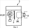 Фиг.4 показывает схематически четвертую форму выполнения, в которой снова источником света Q является электрическая дуга Q. Здесь дополнительно между электрической дугой Q и световодом LWL предусмотрена пластина Р, на которой могут скапливаться частицы обгорания контактов. Это означает, что с увеличением обгорания контактов на пластине Р откладывается все больше частиц обгорания контактов, за счет чего коэффициент пропускания для проходящего от электрической дуги к световоду света становится меньше, то есть свет все сильнее ослабляется. Тем самым на основе интенсивности введенного в световод LWL и направленного к детектору D света можно косвенно контролировать износ коммутационного аппарата. Показанную на фиг.4 пластину Р можно использовать без проблем в комбинации с одной из форм выполнения, показанных на фиг.1 или 2. Сама пластина Р может быть также окном в корпусе, причем свет, исходящий от электрической дуги, пропускают через пластину Р к расположенному вне корпуса световоду LWL и вводят в него. Наряду с описанными до сих пор формами выполнения можно представить себе еще множество других форм выполнения или комбинаций устройств, соответствующих изобретению, пока выполняется основной принцип настоящего изобретения, а именно косвенное контролирование обгорания контактов коммутационных контактов K1, K1′ с помощью частиц обгорания контактов и тем самым износа электрического коммутационного аппарата S.
