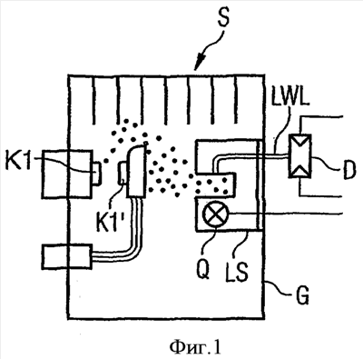 Для определения износа уже известны различные методы и устройства. С помощью некоторых примеров выполнения должно быть описано теперь соответствующее изобретению устройство для контроля, то есть для определения обгорания контактов. Для этого, как показано на фиг.1, предусмотрены световод LWL и источник света Q. Предпочтительным образом этот источник света Q является светоизлучающим диодом, который вместе с световодом LWL образует обычное принятое в торговле фотоэлектрическое реле LS. Исходящий из источника света Q свет имеет определенную интенсивность в зависимости от типа источника света и его управления. Соответственно расположению источника света Q и световода LWL определенная часть света вводится в световод LWL и направляется им к детектору D. В новом коммутационном аппарате S при этом измеренная детектором D интенсивность введенного в световод LWL света имеет определенную величину, то есть заданное значение. С увеличением обгорания контактов на коммутационных контактах К1, К1′ количество частиц обгорания контактов в корпусе G коммутационного аппарата S будет увеличиваться. Если эти частицы обгорания контактов теперь попадают в область между источником света Q и световодом LWL, то исходящий от источника света Q и поступающий в световод LWL свет ослабляется этими частицами обгорания контактов. Это означает, что чем больше частиц обгорания контактов имеется внутри корпуса G и тем самым в области между источником света Q и световодом LWL, тем меньше будет измеренная детектором D интенсивность введенного в световод LWL света. Если зависимость между обгоранием контактов и количеством находящихся в коммутационном аппарате S частиц обгорания контактов один раз установлена, то с помощью вызванного количеством частиц обгорания контактов уменьшения интенсивности введенного в световод LWL света можно контролировать износ коммутационных контактов К1 и К1′ и тем самым износ коммутационного аппарата S.