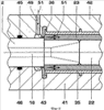 Предварительный корпус 31 и поддерживающие его волоконный корпус 23 эластичные формовочные тела 22 и 35 помещают в состоящую из двух частей устойчивую относительно разрежения и давления литейную форму 40 с нижней формой 41 и верхней формой 42. Эта литейная форма показана в разрезе на фиг.5 и 6. После удаления верхней формы 42 поддерживаемый формовочными телами 22, 35 и двумя кольцами 43, 44 предварительный корпус 31 вводят в нижнюю форму 41. Оба кольца 43, 44 выполнены из металла, предпочтительно из устойчивой к смоле стали, и поддерживают обе кромки 36, 37 формовочного тела 35, по существу, с герметизацией относительно вакуума и жидкости. После ввода предварительного корпуса 31 в нижнюю форму 41 устанавливают верхнюю форму 42 и прижимают ее с помощью крепежных средств к нижней форме 41. В этом случае уплотнительные кольца 45 и 46 герметизируют внутреннее пространство литейной формы 40, по существу, с герметизацией относительно вакуума, давления и жидкости от окружающего пространства. Через отверстия 47 и 48 литейной формы 40 проходят наружу соединительные элементы 2, 3. Дополнительное отверстие, ведущее во внутреннее пространство формы, образует продольный канал 16, через который проходит открытый и выполненный с возможностью соединения с источником сжатого газа конец выполненного в виде баллона формовочного тела 22. Через отверстие 49 можно подавать жидкий полимер, например эпоксидную смолу, внутрь формы. Другое отверстие 50 служит для вентиляции внутреннего пространства формы и выполнено с возможностью соединения с вакуумной установкой.