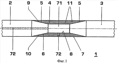 Если, согласно фиг.1, волоконное усиление изоляционной трубы 4 образовано за счет намотки слоями уложенных волокон 11, то конус 6 должен пересекать слои 11 волокна под углом около 10-30° относительно оси изоляционной трубы. Было установлено, что в этом случае при нагрузке передающего усилие элемента 1 крутящим моментом подлежащее передаче усилие одновременно и равномерно передается практически во все волокна. Поэтому эта модификация вала 1 может передавать особенно большие крутящие моменты.
