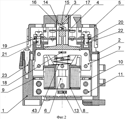 Якорь 7 вместе с траверсой 3 и подвижными мостиковыми контактными узлами 4 установлен в камере 2, которая имеет окна с установленными в них неподвижными контактными узлами 19 и 20. Винты 21 и 22 фиксируют неподвижные контактные узлы 19 и 20 в окнах камеры 2 от выпадения. Для защиты от возможного прикосновения к частям, находящимся под напряжением, и защиты от попадания внутрь аппарата посторонних предметов на камеру 2 установлена крышка 5 со сквозными отверстиями для доступа к винтам 21 и 22 и подсоединения проводов к неподвижным контактным узлам 19 и 20. Камера 2 фиксируется на корпусе 1 при помощи самонарезающих винтов 23.