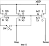 Как показано на Фиг.10, шестой вариант токового зеркала подобен пятому варианту токового зеркала, однако затворные электроды двух дополнительных транзисторов (М5, М3) не соединены с затворными электродами первого и второго транзисторов (M1, M2). Один выключатель (SW1) соединен с электродами стока и истока дополнительного транзистора (М5), а второй выключатель (SW2) соединен с электродами стока и истока другого дополнительного транзистора (М3).