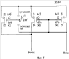 Обратимся вначале к Фиг.5, где показан первый вариант, в котором переднее или заднее токовое зеркало (1, 3) содержит базовый двухтранзисторный (M1, M2) источник тока, дополнительный транзистор (М5) и выключатель (SW1).