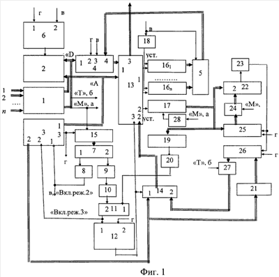 Входы накопителя 1 являются входами устройства (фиг.1), на которые подаются импульсные r-разрядные сигналы n-каналов разнесения в параллельном двоичном коде, сопровождаемые тактовыми импульсами и разделенные маркерами, включающие в себя информационные и тестовые сигналы (см. фиг.6). (Предполагается, что преобразование исходной структуры сигналов, представленной на фиг.4, в структуру на фиг.6 уже осуществлено и производится обычным образом.) Выходы накопителя 1 соединены с шинами данных «D» и с адресными шинами «A» блока 2 памяти, причем адресные шины подключены также к первому выходу блока 3 управления. Шины данных подключены к первому входу блока 4 коммутации, выход которого соединен с линиями шины первого входа ПЛМ 13. Часть линий шины первого входа ПЛМ 13 подключена также к адресным шинам. Линия маркерных импульсов шины данных соединена дополнительно со счетным входом двоичного счетчика 15, с управляющим входом вентиля 24 и через элемент задержки 28 со входом установки в нулевое состояние (уст. «0») двоичного счетчика 17, а линия тактовых импульсов дополнительно – с управляющим входом вентиля 27.