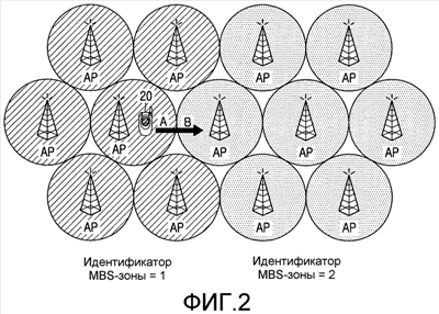 Фиг.2 иллюстрирует конфигурацию системы, в которой сотовые ячейки обеспечивают различные услуги вещания (или различные MBS-услуги) в системе мобильной связи согласно варианту осуществления данного изобретения. Как показано, сотовые ячейки, принадлежащие двум MBS-зонам, обозначенным различными наклонными линиями, обеспечивают различные услуги вещания, и две MBS-зоны имеют идентификатор № 1 и идентификатор № 2 соответственно. Когда терминал 20 доступа перемещается из сотовой ячейки А в направлении сотовой ячейки В, система информирует терминал 20 доступа об изменении в MBS-зоне, и терминал 20 доступа, после распознавания этого изменения, повторно передает запрос на получение относящейся к вещанию информации к его пункту доступа для продолжения приема вещания.