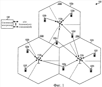 Каждая базовая станция 110 обеспечивает охват соответствующей географической зоны 102. Термином «сота» может называться базовая станция и/или область ее охвата, в зависимости от контекста, в котором термин используется. Для увеличения пропускной способности зона охвата каждой базовой станции может разделяться на множество секторов (например, три сектора 104а, 104b и 104с). Каждый сектор может обслуживаться соответствующей приемопередающей базовой подсистемой (ПБП) (BTS). Термином «сектор» может называться ПБП и/или зона его охвата в зависимости от контекста, в котором термин используется. Для разделенной на сектора соты базовая станция для этой соты обычно включает в себя ПБП для всех секторов этой соты. Последующее описание предполагает, что каждая сота разделяется на множество секторов. Для простоты в последующем описании термин «базовая станция» используется в общем как для неподвижной станции, которая обслуживает соту, так и для неподвижной станции, которая обслуживает сектор. Базовые станции для всех секторов одинаковой соты обычно воплощаются в одной физической базовой станции для этой соты.