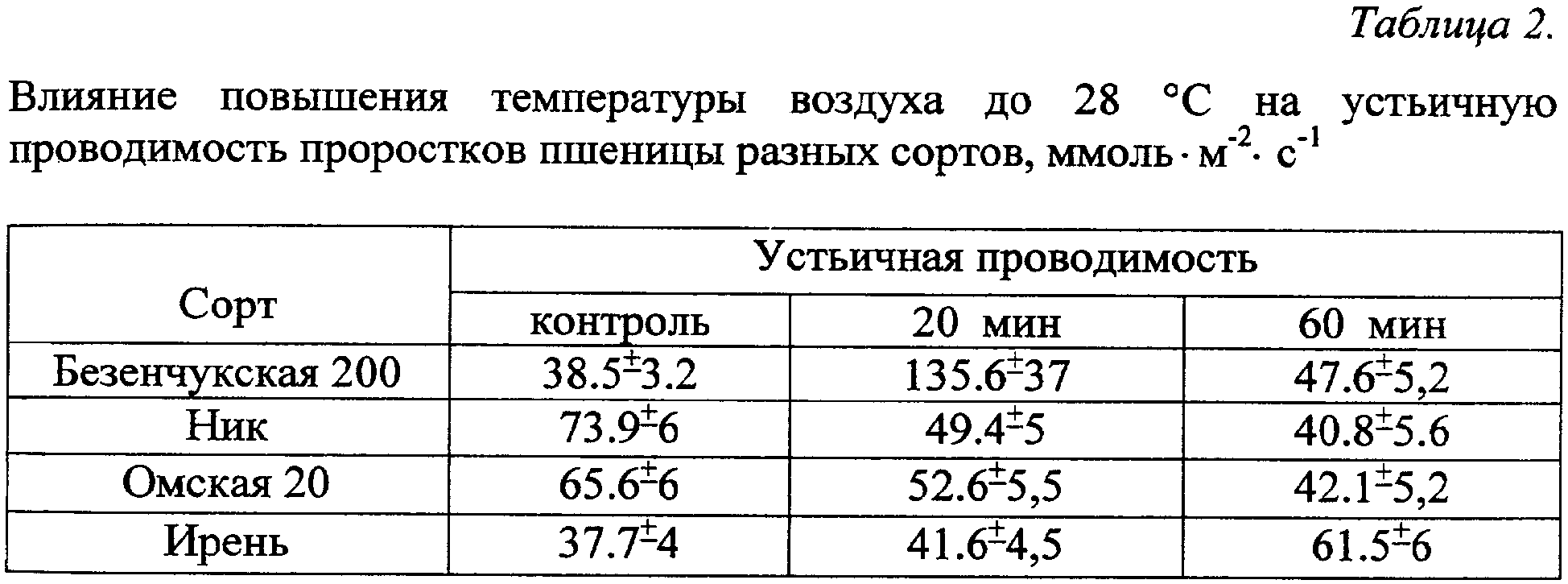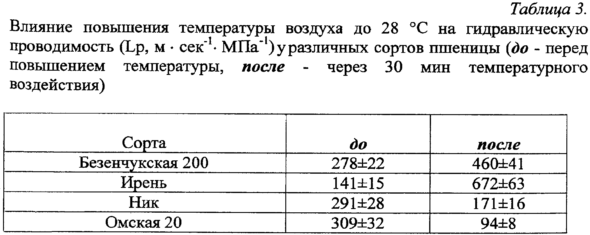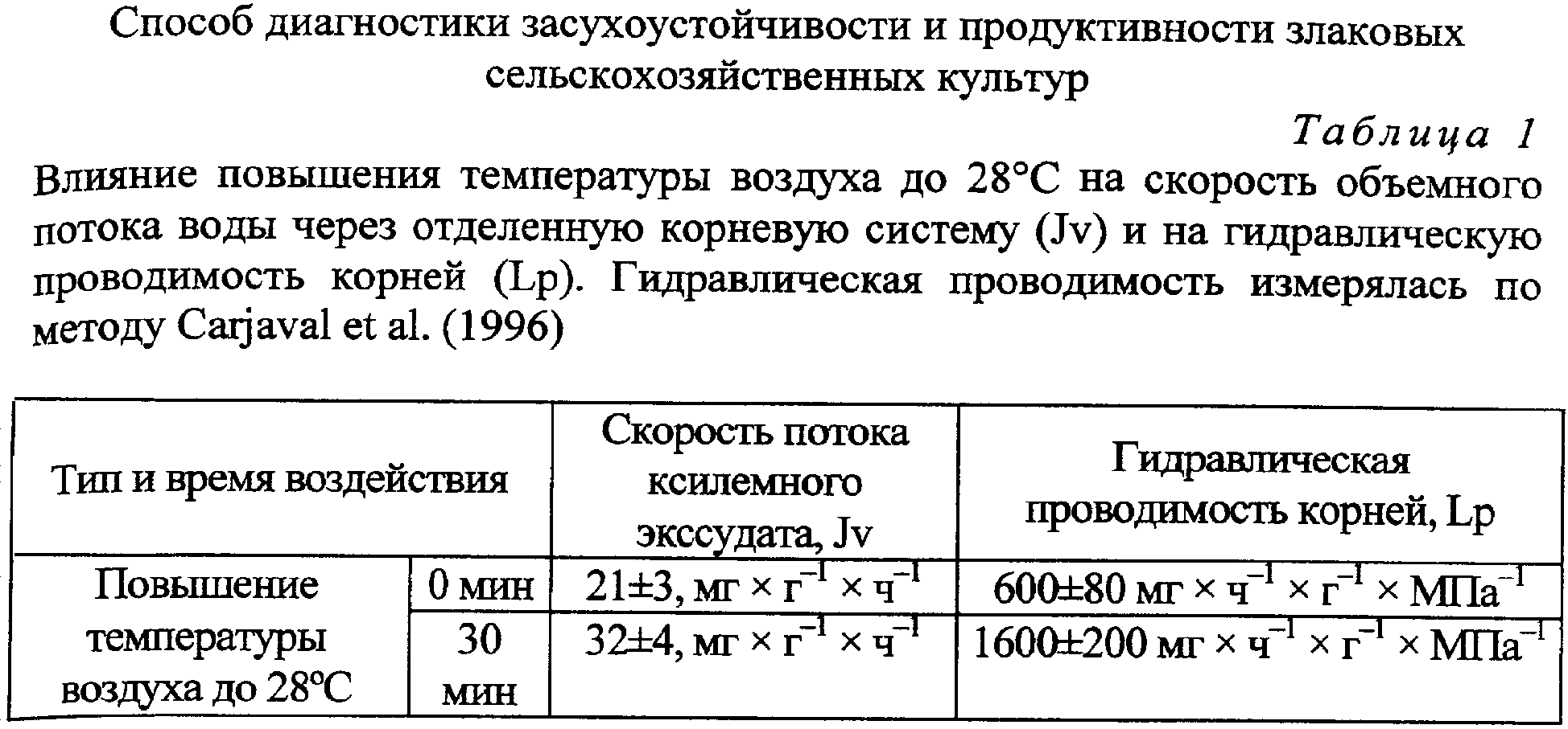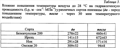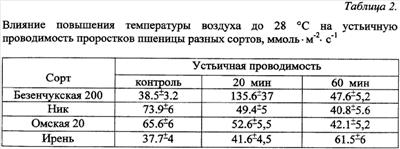 Изобретение относится к области сельского хозяйства, а именно к растениеводству, и может быть применено в селекции злаковых сельскохозяйственных культур для отбора сортов, адаптированных к определенному температурно-влажностному режиму. Установление способности растения поддерживать водный режим при изменении условий окружающей среды является эффективным способом целенаправленной селекции сортов, адаптированных к определенным температурно-влажностным условиям. Известен способ оценки устойчивости растений к засухе северного и южного типа на ранних этапах онтогенеза (патент RU 2062564, 1996 г.), включающий экспонирование 2-дневных проростков в течение 24 часов на растворе осмотика с одновременным воздействием низких или высоких температур, определение интенсивности ростовых процессов по степени восстановления скорости роста корня в сравнении со скоростью роста корня контрольных растений, которые выращивают в течение 10 час и 24 час для оценки засухи северного типа и в течение 24 и 24 час для засухи южного типа. Однако данный способ рассматривает только ростовые процессы, которые зависят от многих факторов, в том числе от водного обмена, уровня фотосинтеза, поступления минеральных солей, дыхания, температуры, освещенности, влажности атмосферы и почвы и др. Предлагаемая нами методика исследования дополнена изучением гидравлической проводимости корней при температурных воздействиях, что позволяет установить механизмы регуляции растением как поступления воды в корень, так и его испарение через лист. Технический результат – выявление генотипических особенностей растений в поддержании оптимального, в соответствии с условиями среды, водного баланса. Указанный технический результат достигается тем, что в способе, включающем измерение устьичной проводимости листьев до и после повышения температуры атмосферы, ее измеряют при температуре атмосферы 24°С и после повышения до 28°С и дополнительно измеряют гидравлическую проводимость корней при температуре атмосферы 24°С и после повышения до 28°С, при снижении устьичной и гидравлической проводимости растение относят к засухоустойчивому типу регуляции водного баланса, при сохранении или повышении устьичной и гидравлической проводимости растение относят к продуктивному типу регуляции водного баланса. Регуляция водного потока у растений осуществляется через изменение гидравлической проводимости корней (способности поглощать воду) и устьичной проводимости (способности к испарению воды в атмосферу). С помощью предлагаемой методики исследования было показано, что растения разных сортов яровой мягкой и твердой пшеницы характеризуются неодинаковой стратегией поддержания водного баланса при изменении температуры окружающей среды (увеличение транспирационного запроса). Растения в одних и тех же условиях могут (1) повышать гидравлическую проводимость в соответствии с транспирационным запросом или (2) снижать устьичную проводимость. Поддержание водного баланса в растении во всех случаях направлено на восстановление оводненности побега и поддержание нароста органов и тканей растяжением. Однако регуляция процессов водного обмена у разных сортов отличается. Сорта (2), закрывающие устьица, уменьшают потери воды через устьица, это позволяет им экономить воду, однако закрыт