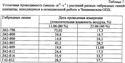 Изобретение относится к области сельского хозяйства, в частности к растениеводству. Способ включает измерение устьичной проводимости листьев до и после повышения температуры атмосферы. Устьичную проводимость листьев измеряют при температуре атмосферы 24°С и после повышения до 28°С. Дополнительно измеряют гидравлическую проводимость корней при температуре атмосферы 24°С и после повышения до 28°С. При снижении устьичной и гидравлической проводимости растение относят к засухоустойчивому типу регуляции водного баланса. При сохранении или повышении устьичной и гидравлической проводимости растение относят к продуктивному типу регуляции водного баланса. Предложенный способ позволяет установить механизмы регуляции растением поступления воды в корень и ее испарение через лист, а также способствует ускорению селекционного процесса. 7 табл.