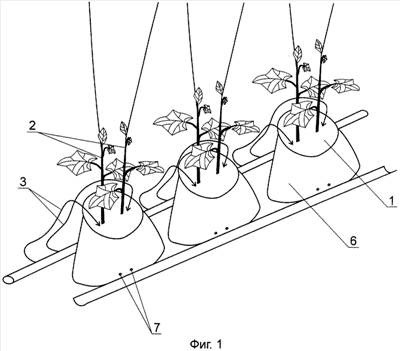 На фиг.1 показана схема размещения растений в теплице при выращивании растений, на фиг.2 – вид сверху мешочка с субстратом, на фиг.3 – разрез А-А фиг.2 с указанием положения растения.