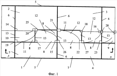 На фиг.1, 2 показаны 4 станка 1, 2, 3, 4 для группового содержания свиней. Ограждения 5,6 и продольные перегородки 11 станков 1, 2, 3, 4 образуют основные логова 7. Продольные перегородки 11 и поворотные калитки 13 перегораживают решетчатый пол 10 пополам, образуя дополнительные логова 12, примыкающие к основным логовам 7 пар противоположных станков 1, 2 и 3, 4. Концы поворотных калиток 13 противоположны поворотным осям 14, 15, 16 и 17, 18 зафиксированы запорными устройствами 19, 20, 21, 22, 23 Свиньи используют площади основных логов 7 для отдыха и кормления, а дополнительные логова 12 – как зону дефекации 8.