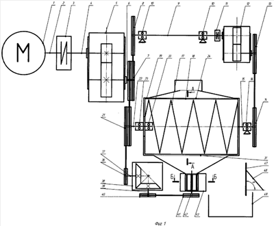 Двухлучевой шкив 21 соединен через клиноременную передачу со шкивом 36, закрепленным на входном валу 37 конического редуктора 38. Последний имеет выходной вал 39, на котором закреплен однолучевой шкив 40, соединенный клиноременной передачей со шкивом 41, установленным на валу 42. Вал 42 закреплен в центрифуге 43, имеющей расположенные внутри лопасти 44. Центрифуга 43 соединена приемным бункером 45 с корпусом 19 с технологическим отверстием 31. Кроме того, центрифуга 43 имеет выходное отверстие 46, напротив которого установлена металлическая плита 47 с регулировочной тягой 48. Металлическая плита 47 установлена под определенным углом для более эффективного раскалывания ореха в зависимости от его влажности. Под плитой 47 размещена приемная емкость 49 для сбора разрушенного ореха.