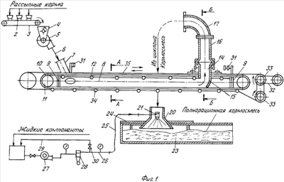 3. Установка по п.1, отличающаяся тем, что, с целью повышения однородности смешивания корма, она снабжена диффузором с битером для разделения кормовых компонентов сначала по скорости витания на крупные и мелкие фракции, а затем смешивания их в потоке воздуха.