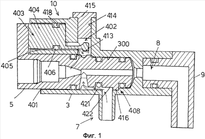 На фиг.1-3 и 16 средство выдачи 5 образует камеру 301 для предварительного смешивания потоков, выходящих из каналов 7 и 10, и камера 301 для предварительного смешивания, в свою очередь, сообщается через предпочтительно коническое поперечное отверстие 302 средства выдачи 5 с выдачным каналом 303 средства выдачи 5.