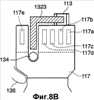 Фиг.8В – наблюдаемый сверху вид состояния, в котором разъем 120 правильно установлен в узле 130 установки разъема. Как очевидно из сравнения фиг.8А и 8В, электродные штыревые контакты с 135а по 135f скомпонованы в местах для вхождения в соприкосновение с нижней экранной структурой 117 (в том числе, небольшими областями с 117а по 117е, нацеленными на защиту электродной структуры 115), открытой на нижнюю поверхность разъема 120.