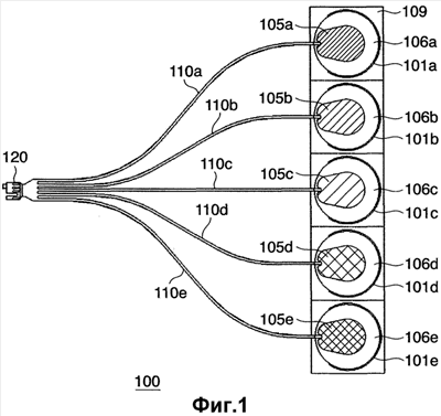 В этом варианте осуществления разделитель 109 – общий для всех электродных площадок с 101а по 101е и имеет перфорацию для разделения. В качестве альтернативы разделитель 109 может быть предусмотрен для каждой электродной площадки. Количество электродов не ограничено пятью, а может любым другим произвольным количеством, таким как три, семь или тому подобным.