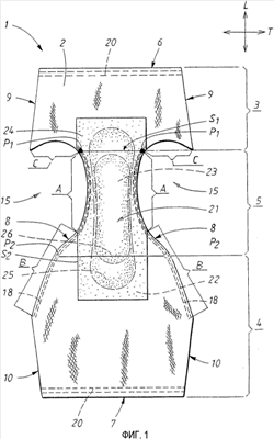 Центральная часть 21 включает в себя барьерный слой 22 для жидкости, адсорбентный центр 23 и пропускающий жидкость внутренний слой 24. Центральная часть 21 прикреплена к барьерному слою 22 для жидкости напротив внешних трусов 2. Фиг.1 показывает адсорбентный центр 23, состоящий из двух наложенных адсорбентных слоев 25, 26, где низший адсорбентный слой 25, который расположен ближе всего к барьерному слою 22 для жидкости, является немного большим, чем верхний адсорбентный слой 26, который расположен ближе всего к внутреннему слою 24. На показанном примере центральная часть 21 имеет угловую форму песочных часов на плоскости, причем плоская форма центральной части определяется формой барьерного слоя 22 для жидкости и пропускающего жидкость наружного слоя 24, которые вместе окружают адсорбентный центр 23. Естественно, возможно использовать центральные части 21, имеющие различную плоскую форму. Барьерный слой 22 для жидкости и внутренний слой 24 могут, например, иметь более закругленную форму песочных часов, прямоугольную форму, трапециевидную форму, овальную форму и т.д. Кроме того, нет необходимости, чтобы центральная часть 21 имела размер, показанный на фиг.1. Можно использовать как большие, так и меньшие адсорбентные центры 23, в зависимости от желаемой адсорбентной способности трусов. Далее не является необходимым прикреплять адсорбентный центр 23 к специальной центральной части. Вместо этого, барьерный слой 22 для жидкости и пропускающий жидкость наружный слой 24 могут являться неотъемлемыми частями наружных трусов 2.