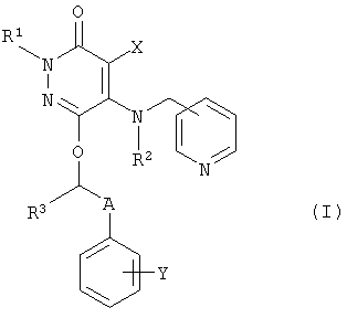 Особенно предпочтительными являются соединения пиридазинона формулы (I), где R1 и R2 представляют собой атомы водорода, R3 представляет собой атом водорода или C1-4алкил, Х представляет собой атом галогена, Y представляет собой атом галогена или атом водорода и А представляет собой C1-5алкилен, который может быть замещен гидроксильной группой.