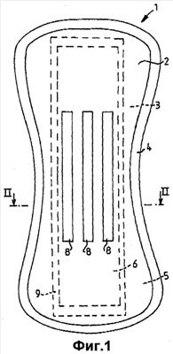 Фиг.1 изображает иллюстративный пример абсорбирующего продукта, такого как гигиеническая прокладка, пеленка, вставка для трусов, средство защиты от недержания и т.п., пригодного для настоящего изобретения.