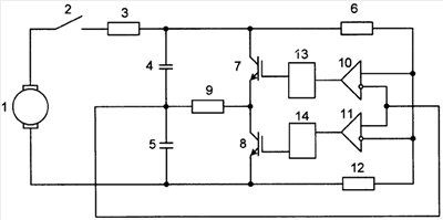 Устройство для регулирования скорости электроподвижного состава работает следующим образом. В режиме электрического торможения тяговый двигатель постоянного тока 1 вырабатывает электроэнергию, которая аккумулируется в накопителе на первом 4 и втором 5 конденсаторах большой емкости (ионисторах). Тормозной резистор 3 ограничивает ток в цепи заряда конденсаторов. Во время заряда напряжение на первом 4 и втором 5 конденсаторах, включенных последовательно, будет увеличиваться обратно пропорционально их действительной емкости, поэтому конденсатор с большей емкостью зарядится до меньшего напряжения, его энергетические характеристики окажутся недоиспользованы, а конденсатор с меньшей емкостью зарядится до большего напряжения, что снизит его надежность. Для выравнивания напряжений на первом 4 и втором 5 конденсаторах в процессе заряда параллельно им включены первый 7 и второй 8 биполярные транзисторы с изолированными затворами, а в диагональ образованного моста – резистор 9. Для управления первым 7 и вторым 8 биполярными транзисторами с изолированными затворами используются первый 10 и второй 11 компараторы, инверсный вход первого 10 и прямой вход второго 11 компараторов соединены с общим выводом первого 4 и второго 5 конденсаторов, а прямой вход первого 10 и инверсный вход второго 11 компараторов соединены с делителем напряжения на втором 6 и четвертом 12 резисторах. При возникновении разбаланса между напряжением на среднем выводе делителя напряжения, образованного вторым 6 и четвертым 12 резисторами, и среднем выводе делителя напряжения, образованного первым 4 и вторым 5 конденсаторами, на входе одного из компараторов: первого 10 или второго 11 появляется разность напряжений, которая переключает его в состояние «включен». Этот сигнал с помощью согласующего блока: первого 13 или второго 14 усиливается и преобразуется в сигнал необходимого уровня для отпирания соответствующего первого 7 или второго 8 биполярного транзистора с изолированным затвором. Отпираясь, соответствующий биполярный транзистор с изолированным затвором шунтирует конденсатор, на котором оказалось большее напряжение, третьим резистором 9. Конденсатор, на котором оказалось меньшее напряжение, будет заряжаться большим током до тех пор, пока напряжение на первом 4 и втором 5 конденсаторах не выровняется. Таким образом, в течение всего цикла заряда будет поддерживаться равенство напряжений на конденсаторах и их емкость будет использоваться полностью.