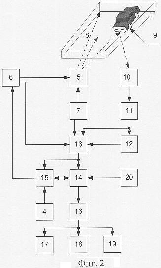 При появлении транспортного средства в пределах области сканирования 8 приемником 10 будет регистрироваться отраженный сигнал, который поступит с выхода названного приемника на селективный усилитель 11, а с выхода последнего очищенный от помех и усиленный до требуемой величины сигнал поступает на вход блока 12 обнаружения отраженного сигнала, на выходе последнего в зависимости от параметров принятого сигнала формируется сигнал логического нуля или единицы. Сигнал уровня логической единицы свидетельствует о том, что в данный момент (при данном пространственном положении луча сканера) найден физический объект. Далее по сигналам от блока 6 управления сканированием, генератора 7 опорного сигнала и селективного усилителя 11 в блоке 13 определения координаты негабаритности на основе анализа отраженных от транспортного средства 9 сигналов производится вычисление основных параметров транспортного средства (габарита, координаты, скорости и ускорения). Блок 13 определения координаты негабаритности реализован на базе микропроцессора, что существенно упрощает стандартные вычислительные процедуры (скорости по разности частот падающего и отраженного сигналов по формуле эффекта Доплера и расстояния по фазовому сдвигу и т.д.), результатом которых является вычисление текущих координат габарита и расчет времени ожидаемого проследования данного транспортного средства через плоскость габаритных ворот. Полученные данные передаются в блок 14 управления включением заграждающих механизмов, также выполненный на базе микропроцессора.