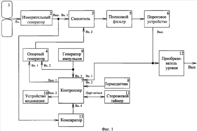 Индуктивно-проводной датчик, изображенный на фиг.1, содержит индуктивный шлейф 1, соединенный с входом (Вх) измерительного генератора 2, выход (Вых) которого подключен к ЦОН, состоящей из последовательно соединенных смесителя 3, первый вход (Bx1) которого является входом ЦОН, а второй вход (Вх2) подключен к опорному генератору 4, а так же фильтра 5 и порогового устройства 6, выход (Вых) которого подключен к первому входу (Bx1) контроллера 7, на второй вход (Вх2) которого поступают данные с термодатчика 8. Третий вход (Вх3) контроллера соединен с генератором импульсов 9. Первый выход (Вых1) контроллера соединен с первым входом (Bx1) опорного генератора, второй вход которого (Вх2) соединен с генератором импульсов. Генератор импульсов формирует тактовую частоту для контроллера и опорного генератора. Второй выход контроллера соединен с устройством индикации 10, а порт ввода/вывода (Порт вв/выв) – со сторожевым таймером 11. Выход порогового устройства является выходом ЦОН и соединен с преобразователем уровня 12, выход которого является выходом (Вых) датчика. Выход измерительного генератора соединен с четвертым входом (Вх4) контроллера через компаратор 13 для контроля исправности генератора и индуктивного шлейфа.
