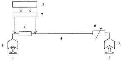 Для контроля состояния РЦ шунт контрольный первым 1 и вторым 2 захватами устанавливают на рельсы 3, с которыми захваты 1, 2 обеспечивают надежный электрический контакт. Соединенные последовательно резистивный элемент 4, монтажный провод 5 и подстроечный элемент 6 через захваты шунтируют рельсы, создавая имитацию наезда колесной пары подвижной единицы на РЦ. Максимальное активное сопротивление колесной пары не должно превышать 0,06 Ом (Рельсовые цепи магистральных железных дорог: Справочник. / Под ред. В.С.Аркатова. – М.: Транспорт, 1982, с.32). Реактивное сопротивление колесной пары на частотах от 0 до 10000 Гц имеет индуктивный характер. Согласно проведенным измерениям индуктивности первых колесных пар ряда подвижных единиц (поезд серии ЕМ, электровоз, мотовоз) на частоте 1000 Гц составляют от 2,5 мкГн до 3,5 мкГн. Соответственно индуктивное сопротивление колесной пары на частотах до 1000 Гц достигает 0,022 Ом, что составляет до 30% от нормативного сопротивления 0,06 Ом. Необходимость учета индуктивности колесной пары поезда объясняется тем, что в современных системах интервального регулирования поездов имеется тенденция к увеличению частоты сигнала КРЛ и сигнала АРС. Например, рабочие частоты системы АБ-УЕ составляют 1953 Гц, 2170 Гц, 2441 Гц, 2790 Гц (И.В.Беляков и др. «Микропроцессорная унифицированная система автоблокировки АБ-УЕ», Автоматика, связь и информатика, №6, 2002); система «Движение» работает на частоте КРЛ 4260 Гц и частоте АРС 3348 Гц (Кузнецов С.В. и др. «Система «Движение»: стационарная аппаратура, центральный пост и единая система радиосвязи», Современные технологии автоматизации, 2001, №2).