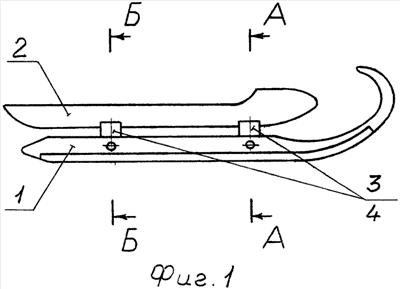 В задней части саней (фиг.3, Б-Б) вертикальные взаимные перемещения сиденья и опорного кронштейна приводят к изгибу W-образной рессоры 14, поверхность которой трется по поверхности кронштейна и сиденья, также поглощая часть энергии вибрации. Упругие прокладки 15 служат дополнительным элементом амортизации. Благодаря такому выполнению достигается заявленный технический результат, а именно существенное снижение уровня вибраций при движении по трассе и, соответственно, нагрузок, воздействующих на спортсмена в широком диапазоне колебаний и массовых характеристик объекта «спортсмен-сани».