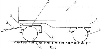 Известен двухосный тракторный самосвальный прицеп модели 785А, описанный в руководстве по уходу и эксплуатации, Сербодский машиностроительный завод, Приволжский информцентр, г.Саратов, 1969 г. Такой прицеп показан на странице 5 руководства и состоит из кузова, установленного на раме, в задней части которой с помощью рессор присоединены ведомые колеса, а в передней установлен поворотный круг, взаимосвязанный с подкатной тележкой, снабженной рулевыми колесами. К подкатной тележке присоединено дышло, предназначенное для сцепа прицепа с трактором тягачом. Несмотря на достаточно высокие эксплутационные показатели, такой прицеп обладает весьма важным недостатком, заключающимся в том, что при транспортировке его в составе тракторного поезда последний подвержен вилянию, то есть колебаниям в поперечной плоскости движения, причем амплитуды виляния настолько велики, что способствует возникновению опасных ситуаций столкновения прицепа со встречно движущимся или обгоняющим его транспортом.