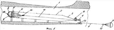 Разделение частей замка 14 предусмотрено при вхождении парашюта 6 в конусную насадку 3 под действием натяжения дополнительного звена (не показано), которое прикрепляют одним концом к подходящему механизму расцепки частей замка 14, а другим – к торцевой крышке 8.