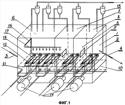 На фиг.1 и 2 показано устройство для обезвоживания хлормагниевого сырья, включающее многокамерную печь 1 кипящего слоя, выполненную в виде корпуса 2 печи с патрубком 3 для подачи сырья и патрубком 4 для вывода готового продукта, с перегородками 5, образующими камеры 6, 7, 8 и снабженными переточным окном 9, газораспределительную решетку 10 в виде подины 11 с отверстиями 12, над которыми размещены уголковые колпачки 13, выносную топку 14, циклоны 15, устройство для подачи воздуха 16, выполненное в виде изогнутой трубы 17 с отверстиями 18, размещенное в первой камере печи над переточным окном перегородки параллельно подине решетки и жестко соединенное с одной стороны с корпусом печи, а с другой стороны с коллектором 19 для сбора нагретых газов. Отверстия устройства для подачи воздуха выполнены в виде щели или круглого сечения. Расстояние между трубами устройства для подачи воздуха равно 0,7 м, количество труб для подачи воздуха в первой камере печи равно 6.
