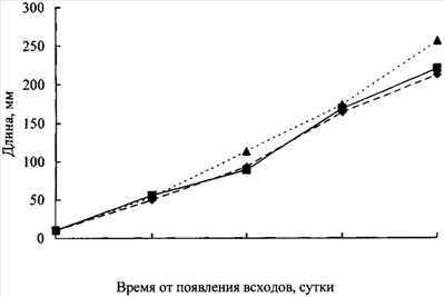 Для того чтобы сделать определенный вывод о возможности последующего применения полученного биогумуса на основе компостосодержащих субстратов из дефеката, проведены испытания его активности на растениях кукурузы. Для этого в биогумус были высажены семена этого растения сорта «Трофи». Были использованы следующие варианты: первый вариант – 1-25% дефекат / 75% жом; 2 вариант – 2-50% дефекат / 50% жом; 3 вариант – 3-75% дефекат / 25% жом. Полученные данные показаны на чертеже, где кривая 1 соответствует первому варианту, кривая 2 – второму варианту, кривая 3 – третьему варианту. Всхожесть семян во всех вариантах была одинаковой, однако отличия по росту были все-таки зафиксированы. Как видно из чертежа, наиболее интенсивным ростом отличались растения, выращиваемые на биогумусе с использованием максимального количества дефеката (75%). Другие варианты не отличались такой скоростью роста кукурузы.