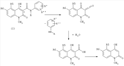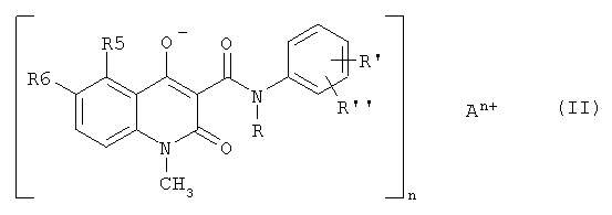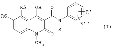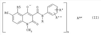 Соединение А представляет собой N-этил-N-фенил-5-хлор-1,2-дигидро-4-гидрокси-1-метил-2-оксо-3-хинолинкарбоксамид. Соединение В представляет собой N-этил-N-фенил-5-этил-1,2-дигидро-4-гидрокси-1-метил-2-оксо-3-хинолинкарбоксамид. Соединение С представляет собой N-метил-N-(2,4-дифторфенил)-5-хлор-1,2-дигидро-4-гидрокси-1-метил-2-оксо-3-хинолинкарбоксамид. Соединение D представляет собой N-метил-N-(4-трифторфенил)-1,2-дигидро-1,5-диметил-4-гидрокси-1-метил-2-оксо-3-хинолинкарбоксамид. Соединение Е представляет собой N-этил-N-фенил-5,6-метилендиокси-1,2-дигидро-4-гидрокси-1-метил-2-оксо-3-хинолинкарбоксамид. Соединение F представляет собой N-этил-N-фенил-5-метилтио-1,2-дигидро-4-гидрокси-1-метил-2-оксо-3-хинолинкарбоксамид. Следующие детализированные примеры 2-7 служат иллюстрацией способа изготовления соединений формулы (II), которые применяются в фармацевтических композициях в соответствии с настоящим изобретением. Пример 2 Натриевая соль N-этил-N-фенил-5-хлор-1,2-дигидро-4-гидрокси-1-метил-2-оксо-3-хинолинкарбоксамида N-этил-N-фенил-5-хлор-1,2-дигидро-4-гидрокси-1-метил-2-оксо-3-хинолинкарбоксамид (28 ммолей, 10,0 г) суспендировали в 99,5%-ном этаноле (150 мл) и добавляли 5 М водный раствор гидроокиси натрия (28,4 ммоля, 5,68 мл). Реакционную смесь перемешивали в течение 30 минут при комнатной температуре. Полученный кристаллический осадок отделяли фильтрованием, дважды быстро промывали холодным этанолом (2×150 мл) и сушили при пониженном давлении над P2O5 для получения соединения, указанного в заголовке (9,5 г, выход – 90%). Аналитические расчеты для C19H16ClN2O3Na: С, 60,2; Н, 4,26; N, 7,40. Найдено С, 60,4; Н, 4,20; N, 7,32. Растворимость в воде при комнатной температуре была 138 мг/мл. Пример 3 Кальциевая соль N-этил-N-фенил-5-хлор-1,2-дигидро-4-гидрокси-1-метил-2-оксо-3-хинолинкарбоксамида Натриевую соль N-этил-N-фенил-5-хлор-1,2-дигидро-4-гидрокси-1 -метил-2-оксо-3-хинолинкарбоксамида (2,63 ммоля, 1,0 г) растворяли в смеси этанола (10,5 мл) и воды (5,3 мл). Раствор нагревали до 70°С и добавляли раствор гидрата ацетата кальция в воде (1 М раствор, 1,05 эквив., 1,38 ммоля, 1,38 мл). Полученную суспензию перемешивали в течение 30 минут, затем охлаждали и кристаллы отделяли фильтрованием, промывали водой и высушивали при пониженном давлении (966 мг, выход – 98%). Аналитические расчеты для С38Н32Cl2N4O6Са: С, 60,7; Н, 4,29; N, 7,45. найдено С, 60,5; Н, 4,34; N, 7,41. Растворимость в воде при комнатной температуре была около 1,0 мг/мл. Эту соль считали труднорастворимой в воде. Пример 4 Железная (III) соль N-этил-N-фенил-5-хлор-1,2-дигидро-4-гидрокси-1-метил-2-оксо-3-хинолинкарбоксамида Натриевую соль N-этил-N-фенил-5-хлор-1,2-дигидро-4-гидрокси-1-метил-2-оксо-3-хинолинкарбоксамида (5,0 г, 13,2 ммоля) растворяли в воде (80 мл) при 40°С и добавляли хлороформ (100 мл). Добавляли пентагидрат сульфата железа (III) (0,95 эквив., 2,09 ммоля, 1,023 г), растворенный в воде (30 мл). Двухфазную систему энергично перемешивали и рН водной фазы доводили до 8 с помощью 1 М NaOH. Отделяли темно-красную органическую фазу, высушивали над сульфатом натрия и удаляли растворители, чтобы получить указанное в заголовке соединение в виде красной аморфной стекловидной массы (4,22 г, выход – 85%). MS-ESI: m/z 1122 [МН]+. Стекловидную массу растворяли в метаноле, происходило образование красных кристаллов указанного в заголовке соединения. Кристаллы отфильтровывали, промывали метанолом и сушили при пониженном давлении для получения указанного в заголовке соединения (3,96 г, выхо