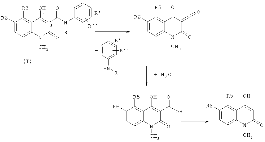 1. Стабильная твердая фармацевтическая композиция, по существу, состоящая из эффективного количества соли формулы (II) где n представляет собой целое число 1, 2 или 3; Аn+ представляет собой моно- или поливалентный катион металла, выбранный из Li+ , Na+, К+, Mg2+, Са2+, Mn2+, Cu2+, Zn2+, Al3+ и Fe3+; R представляет собой линейный или разветвленный С1-С4-алкил или -алкенил или циклический С3-С4-алкил; R5 представляет собой линейный или разветвленный, насыщенный или ненасыщенный С1-С4-алкил или -алкенил, циклический С3-С4-алкил, линейный или разветвленный С1-С4-алкилтио, циклический С3-С4-алкилтио, линейный или разветвленный С1-С4-алкилсульфинил, циклический С3-С4-алкилсульфинил, фтор-, хлор-, бром-, трифторметил или трифторметокси; и R6 представляет собой водород; или R5 и R6 вместе представляют собой метилендиокси; R’ представляет собой водород, линейный или разветвленный, насыщенный или ненасыщенный С1-С4-алкил или -алкенил, циклический С3-С4-алкил, линейный или разветвленный С1-С4-алкокси, циклический С3-С4-алкокси, фтор-, хлор-, бром- или трифторметил; и R” представляет собой водород, фтор- или хлор- при условии, что R” представляет собой фтор- или хлор- только в том случае, если R’ представляет собой фтор- или хлор-; щелочно-реакционный компонент, поддерживающий рН предпочтительно выше 8, или соль с катионом двухвалентного металла; и, по меньшей мере, один фармацевтически приемлемый эксципиент; в которой указанная соль формулы (II), по существу, стабильна при хранении при комнатной температуре в течение, по меньшей мере, 3 лет. 2. Твердая фармацевтическая композиция по п.1, в которой соль формулы (II) представляет собой литиевую или кальциевую соль N-этил-N-фенил-3-хлор-1,2-дигидро-4-гидрокси-1-метил-2-оксо-3-хинолинкарбоксамида или литиевую, кальциевую или цинковую соль N-этил-N-фенил-5-этил-1,2-дигидро-4-гидрокси-1-метил-2-оксо-3-хинолинкарбоксамида. 3. Твердая фармацевтическая композиция по п.1 или 2, в которой соль формулы (II) присутствует в количестве от 0,01 до 10% по весу композиции, предпочтительно от 0,1 до 2% по весу композиции. 4. Твердая фармацевтическая композиция по п.1, в которой щелочно-реакционный компонент выбирают из натриевой, калиевой, кальциевой и алюминиевой солей уксусной кислоты, угольной кислоты, лимонной кислоты и фосфорной кислоты. 5. Твердая фармацевтическая композиция по п.1, в которой щелочно-реакционный компонент присутствует в количестве от 0,1 до 99% по весу композиции, предпочтительно от 1 до 20% по весу композиции. 6. Твердая фармацевтическая композиция по п.1, в которой соль с катионом двухвалентного металла является ацетатом кальция. 7. Твердая фармацевтическая композиция по п.6, в которой ацетат кальция присутствует в количестве от 1 до 10% по весу композиции. 8. Твердая фармацевтическая композиция по п.1, в которой фармацевтически приемлемый эксципиент выбирают из твердых порошкообразных носителей, связующих соединений, дезинтегрирующих соединений и смазывающих веществ. 9. Твердая фармацевтическая композиция по п.8, в которой твердые порошкообразные носители выбирают из маннита, микрокристаллической целлюлозы, гидрофосфата кальция, сульфата кальция и крахмала. 10. Твердая фармацевтическая композиция по п.1, в которой связующие соединения выбирают из поливинилпирролидона, крахмала и гидроксипропилметилцеллюлозы. 11. Твердая фармацевтическая композиция по п.1, в которой де