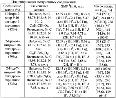 Одностадийный способ получения нитропроизводных 2-галоген-9,10-дигидро-9-акридинонов, включающий обработку раствора 5-галоген-3-арил-2,1-бензизоксазолов в хлороформе или дихлорметане концентрированной азотной кислотой при 10-40°С.