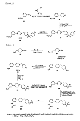 Так, например, соединения настоящего изобретения могут быть использованы для расширения сосудов и сокращения гладкой мышцы, а также для лечения бронхостеноза, заболеваний головного мозга, таких как сосудистые расстройства, например расстройства кровообращения, вызываемые расширением сосудов, и вазоспастические заболевания, такие как стенокардия, головная боль, мигрень и болезнь Рейно; и невропатологических расстройств, включая болезнь Паркинсона и болезнь Альцгеймера; для модуляции расстройств сердечно-сосудистой системы; для профилактики и лечения приступов церебрального инфаркта (апоплексического удара), таких как удар или ишемия головного мозга; и для лечения расстройств кишечного тракта, которые характеризуются нарушениями серотонинергической системы, а также нарушениями углеводного обмена. Эти соединения могут быть также полезны для лечения ассоциированных со стрессом соматических расстройств; симпатической рефлекторной дистрофии, такой как синдром “плечо/кисть”; расстройств мочевого пузыря, таких как цистит; гиперрефлексии мышцы-сжимателя мочевого пузыря и недержания мочи; и болей или болевых ощущений, вызываемых любыми из вышеуказанных расстройств или ассоциированных с ними, а в частности распространения боли при мигрени.