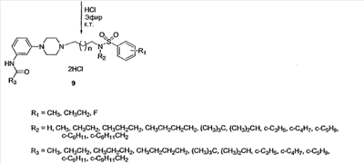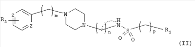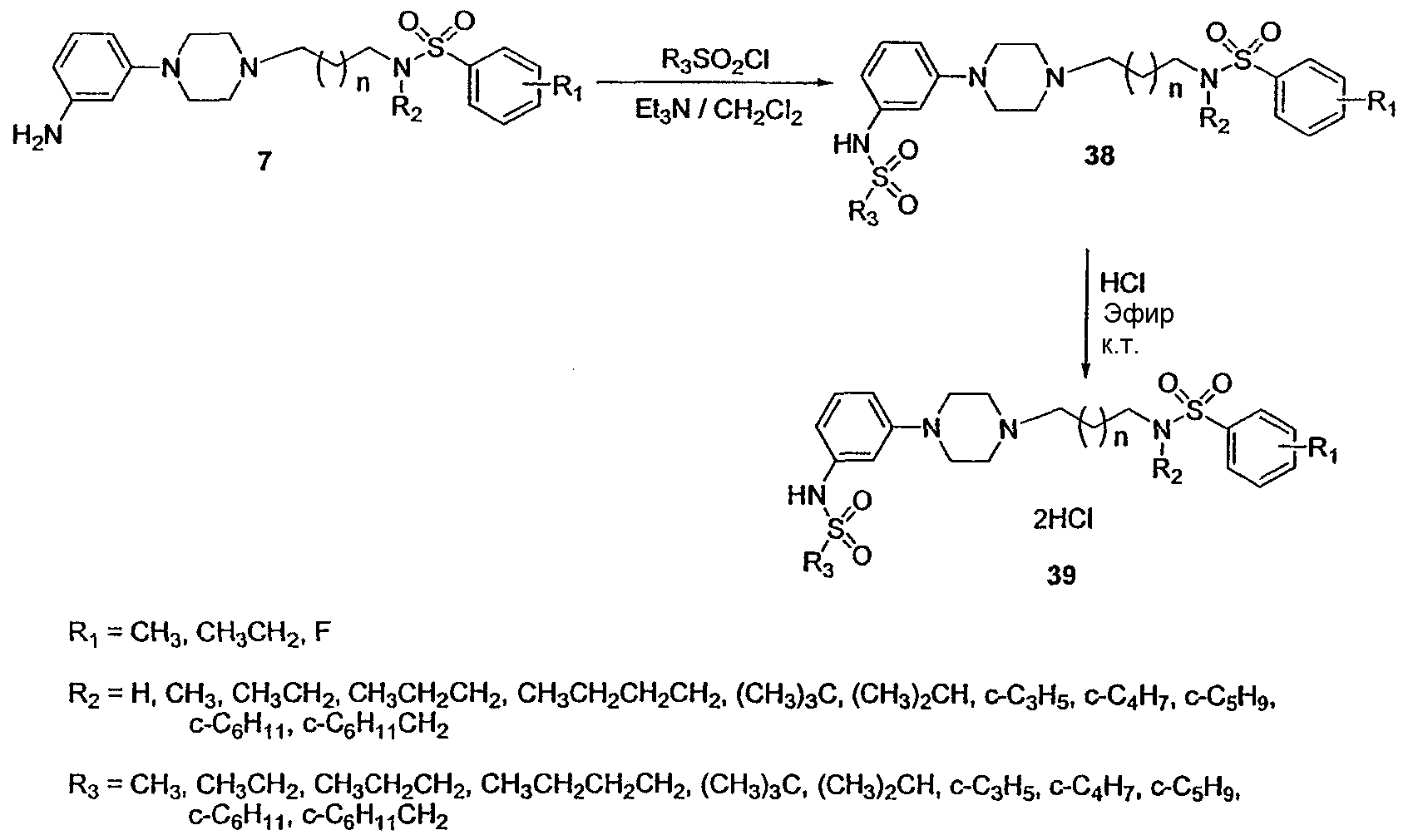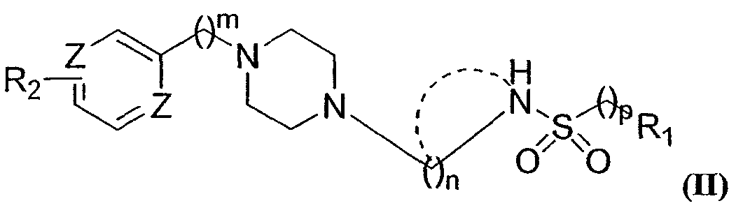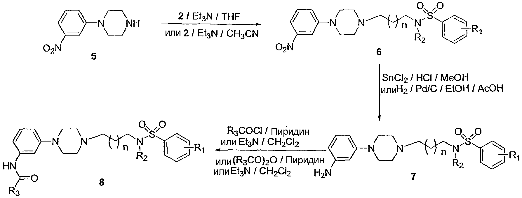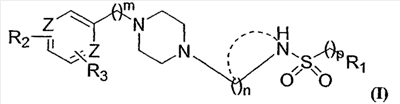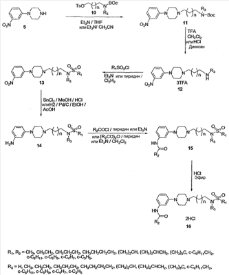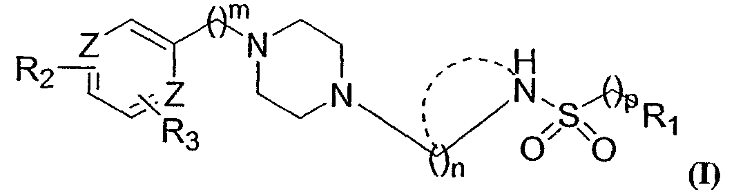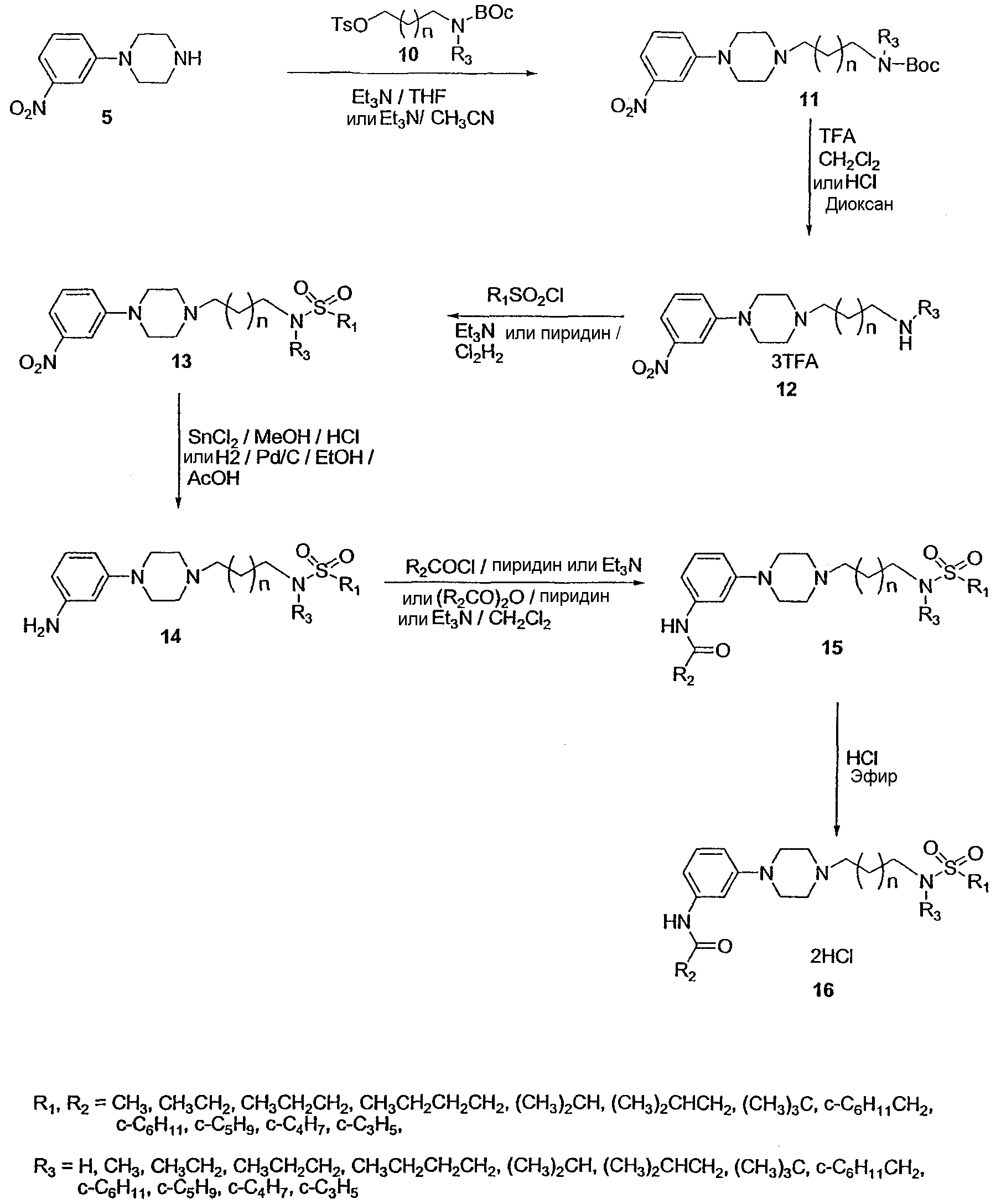 В конкретных вариантах, соединениями настоящего изобретения являются 4-метил-N-{4-[4-(3-нитрофенил)пиперазин-1-ил]бутил}-бензолсульфонамид; HCl-соль 4-метил-N-{4-[4-(3-нитрофенил)пиперазин-1-ил]бутил}-бензолсульфонамида; (3-{4-[4-(толуол-4-сульфониламино)бутил]пиперазин-1-ил}фенил)амид циклопропанкарбоновой кислоты; N-(3-{4-[4-(толуол-4-сульфониламино)бутил]пиперазин-1-ил}фенил)бутирамид; 2,2-диметил-N-(3-{4-[4-(толуол-4-сульфониламино)бутил]пиперазин-1-ил}фенил)пропионамид; N-(3-{4-[4-(толуол-4-сульфониламино)бутил]пиперазин-1-ил}фенил)изобутирамид; N-{4-[4-(3-этансульфониламинофенил)пиперазин-1-ил]бутил}-4-метилбензолсульфонамид; 4-метил-N-(4-{4-[3-(пропан-2-сульфониламино)фенил]пиперазин-1-ил}бутил)бензолсульфонамид; 4-метил-N-{4-[4-(3-нитрофенил)пиперазин-1-ил]бутил}-бензолсульфонамид; 4-метил-N-[4-(4-пиридин-2-ил-пиперазин-1-ил)-бутил]бензолсульфонамид; N-{4-[4-(2-метокси-5-нитрофенил)пиперазин-1-ил]бутил}-4-метилбензолсульфонамид; 4-метил-N-[4-(4-пиримидин-2-илпиперазин-1-ил)бутил]-бензолсульфонамид; N-{4-[4-(3-метоксифенил)пиперазин-1-ил]бутил}-4-метилбензолсульфонамид; N-{4-[4-(3-этансульфониламинофенил)пиперазин-1-ил]бутил}-4-метилбензолсульфонамид; N-{4-[4-(3-метансульфониламинофенил)-пиперазин-1-ил]бутил}-4-метилбензолсульфонамид; 4-метил-N-{4-[4-(3-пиразин-2-илфенил)пиперазин-1-ил]бутил}бензолсульфонамид; N-[4-(4-бифенил-3-илпиперазин-1-ил)бутил]-4-метилбензолсульфонамид; 4-метил-N-[4-(4-фенилпиперазин-1-ил)бутил]бензолсульфонамид; С-циклогексил-N-{4-[4-(2-метоксифенил)пиперазин-1-ил]бутил}метансульфонамид; N-(3-{4-[4-(толуол-4-сульфониламино)бутил]пиперазин-1-ил}фенил)ацетамид; N-(3-{4-[4-(толуол-4-сульфониламино)бутил]пиперазин-1-ил}фенил)пропионамид; (3-{4-[1-(4-фтор-бензолсульфонил)пиперидин-4-илметил]пиперазин-1-ил}фенил)диметиламин; 1-[1-(4-фторбензолсульфонил)пиперидин-4-илметил]-4-пиридин-2-илпиперазин; С-циклогексил-N-{4-[4-(3-диметиламинофенил)пиперазин-1-ил]бутил}метансульфонамид; С-циклогексил-N-[4-(4-пиридин-2-илпиперазин-1-ил)бутил]-метансульфонамид; N-(3-{4-[1-(4-фторбензолсульфонил)пиперидин-4-илметил]пиперазин-1-ил}фенил)ацетамид; N-(3-{4-[4-(4-фторбензолсульфониламино)бутил]пиперазин-1-ил}фенил)ацетамид; N-{3-[4-(4-циклогексилметансульфониламинобутил)пиперазин-1-ил]фенил}ацетамид; N-{3-[4-(1-циклогексилметансульфонил-пиперидин-4-илметил)пиперазин-1-ил]фенил}ацетамид; {3-[4-(4-циклогексилметансульфониламинобутил)пиперазин-1-ил]фенил}амид циклопропанкарбоновой кислоты, N-(3-{4-[1-(пропан-2-сульфонил)пиперидин-4-илметил]пиперазин-1-ил}фенил)ацетамид; N-(3-{4-[4-(пропан-2-сульфониламино)бутил]пиперазин-1-ил}фенил)ацетамид; N-{3-[4-(4-циклогексансульфониламинобутил)-пиперазин-1-ил]фенил}ацетамид; N-(3-{4-[4-(циклогексилметансульфонилметиламино)бутил]пиперазин-1-ил}фенил)ацетамид; N-(3-{4-[4-(2-метилпропан-1-сульфониламино)-бутил]пиперазин-1-ил}фенил)ацетамид; N-[3-(4-{4-[метил-(2-метилпропан-1-сульфонил)амино]бутил}пиперазин-1-ил)фенил]-ацетамид; N-(3-пиперазин-1-илфенил)ацетамид, (3-пиперазин-1-илфенил)амид циклопропанкарбоновой кислоты и 1-(2-метоксифенил)-4-[1-(толуол-4-сульфонил)пиперидин-3-илметил]пиперазин.